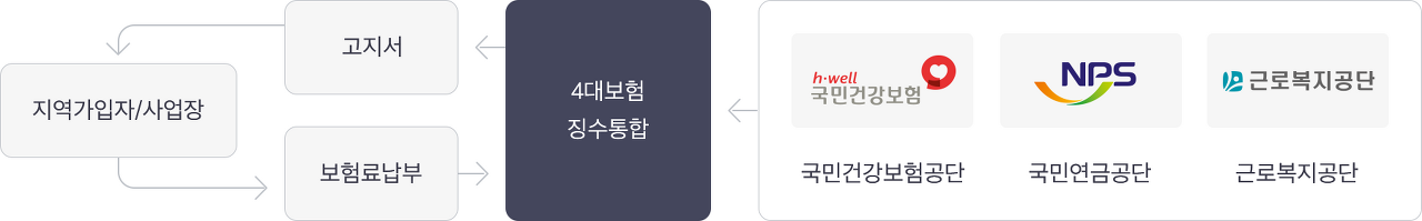2011년 1월부터 국민건강보험공단, 국민연금공단, 근로복지공단에서 각각 수행하였던 건강보험, 국민연금, 고용보험, 산재보험의 업무 중 유사·중복성이 높은 보험료 징수업무(고지, 수납, 체납)를 국민건강보험공단이 통합하여 운영하는 제도입니다.