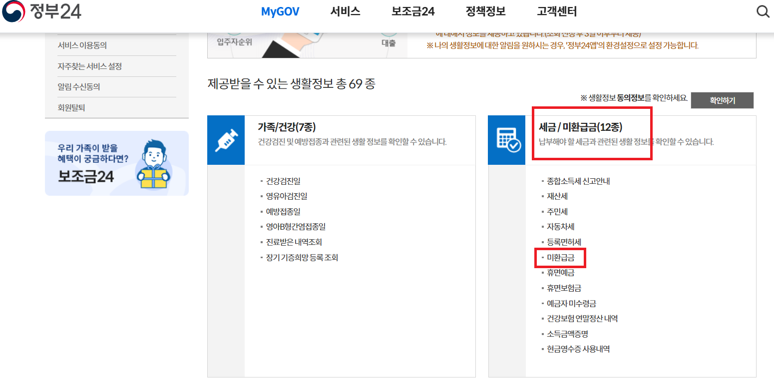 미환급공과금을 클릭하면 정부24(민원24) 사이트로 이동합니다. 그러면 미환급금 메뉴를 클릭하여 본인 인증 후 미환급금 내역을 조회하고 바로 신청하시길 바랍니다.